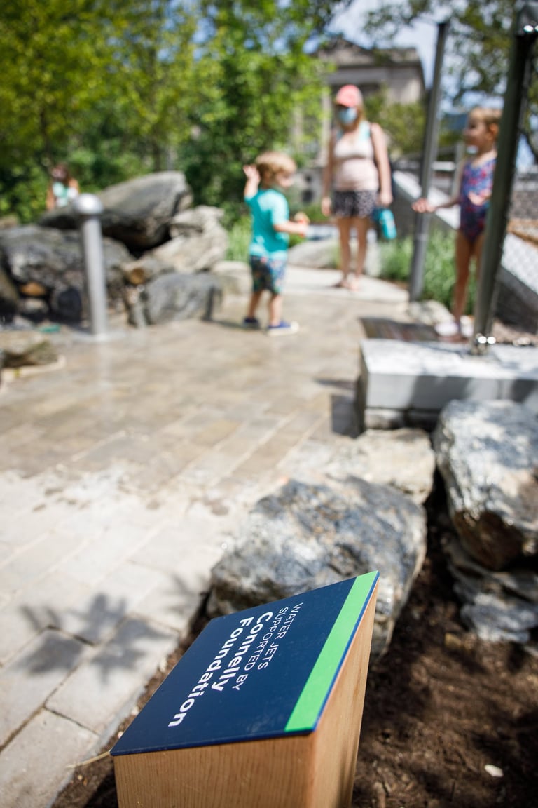 This Discovery Garden pillar was designed to give thanks to our generous donors and also act as a placement marker for the garden itself. The pillar is made from a 12’ by 12’ wood post with a green metal cap at the top with the park’s primary color. The metal donor sign was then wrapped around the post at eye-level for better interaction for both adults and kids. Within the garden, another donor sign was also made from a 12’ by 12’ post but was cut in a slant for the placement of the metal sign for better readability.