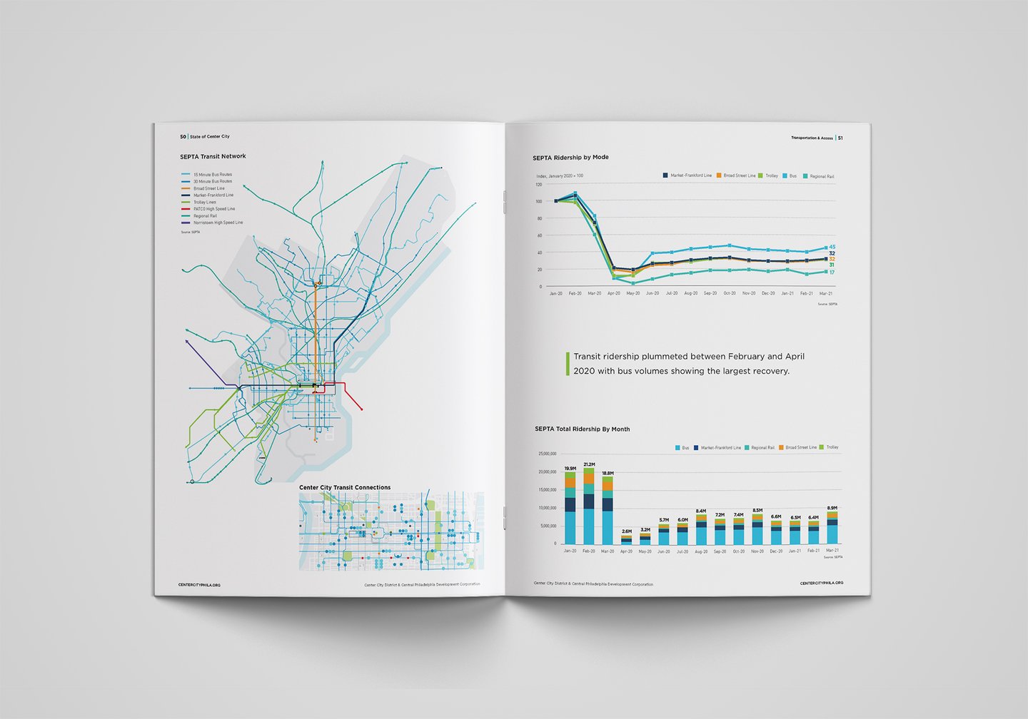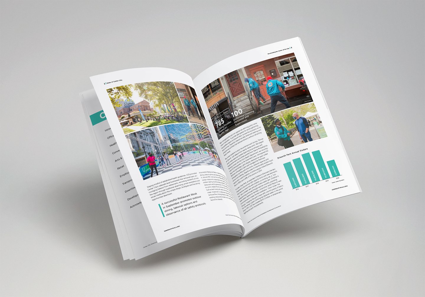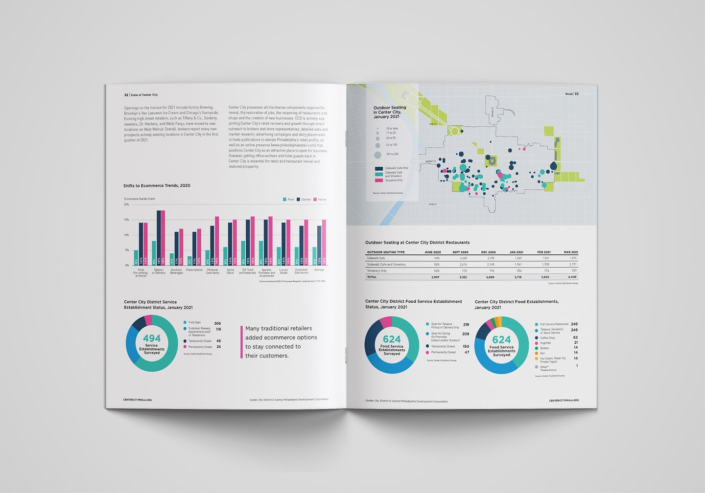The 2021 yearly report of the Center City District encapsulates extensive cross-departmental research focused on the vibrancy of the central city and recommendations for its expansion. In addition to spearheading the report's design.