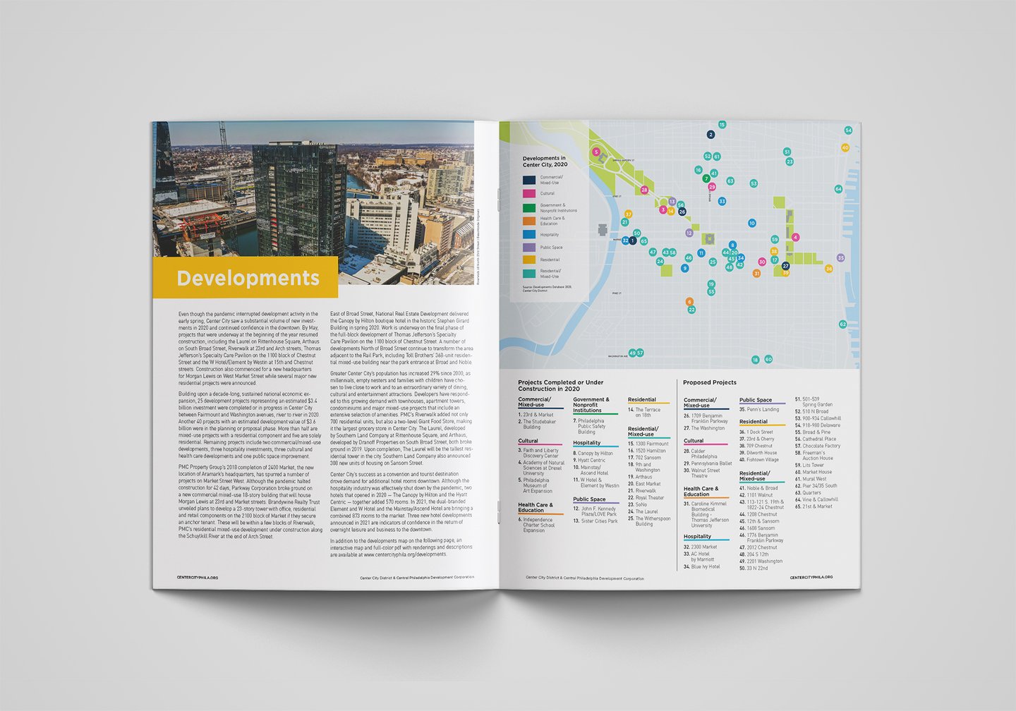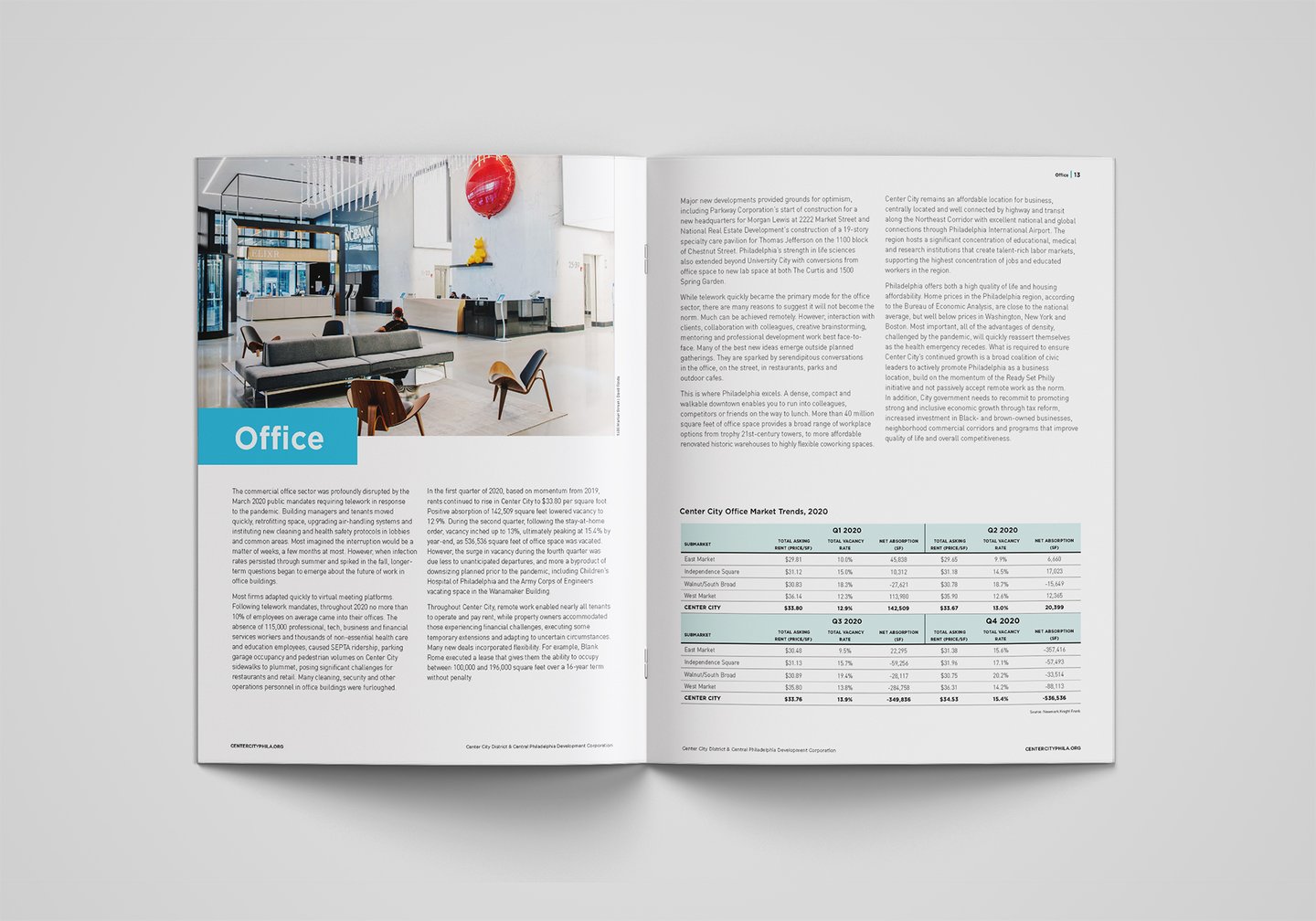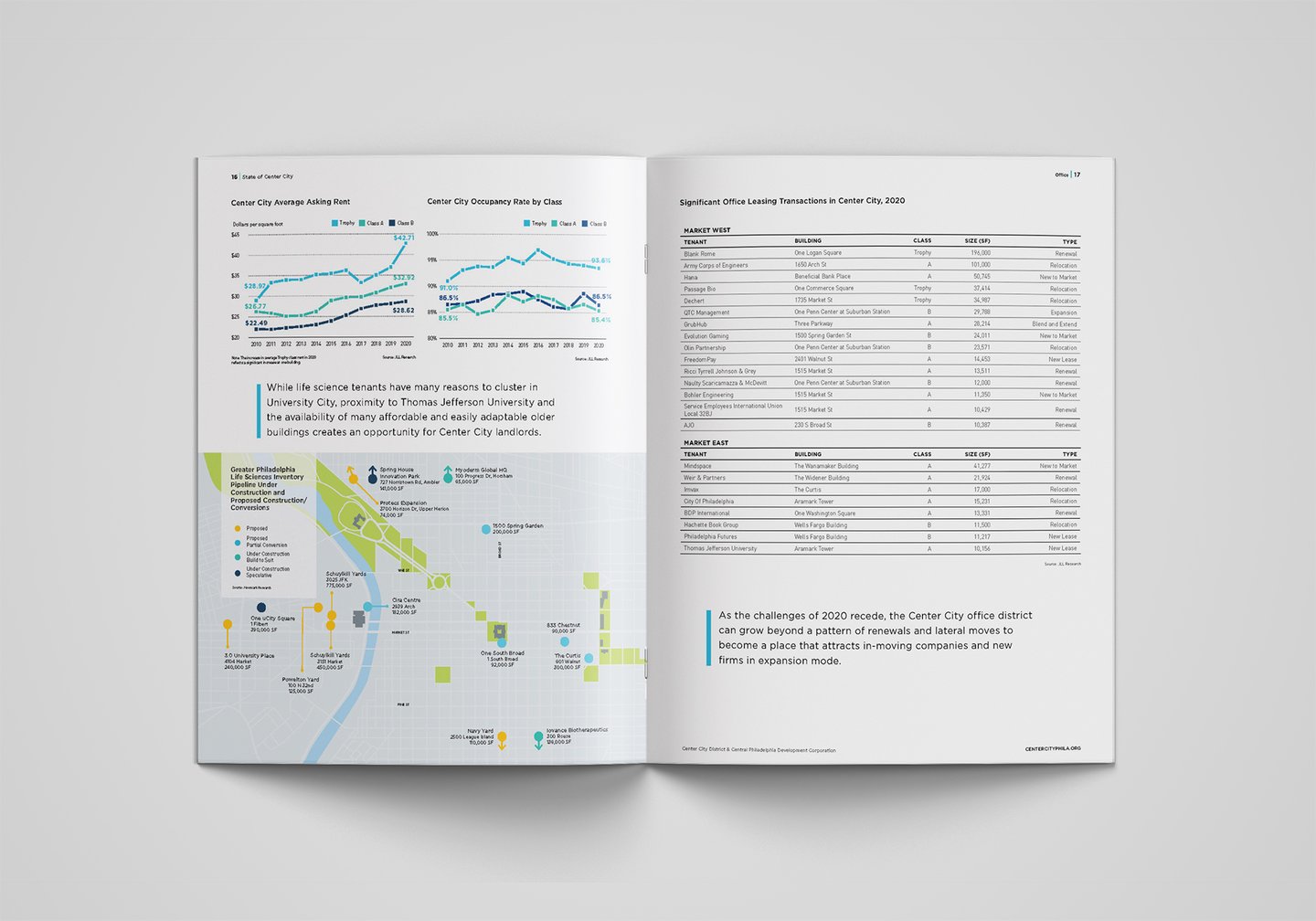 The 2021 yearly report of the Center City District encapsulates extensive cross-departmental research focused on the vibrancy of the central city and recommendations for its expansion. In addition to spearheading the report's design.